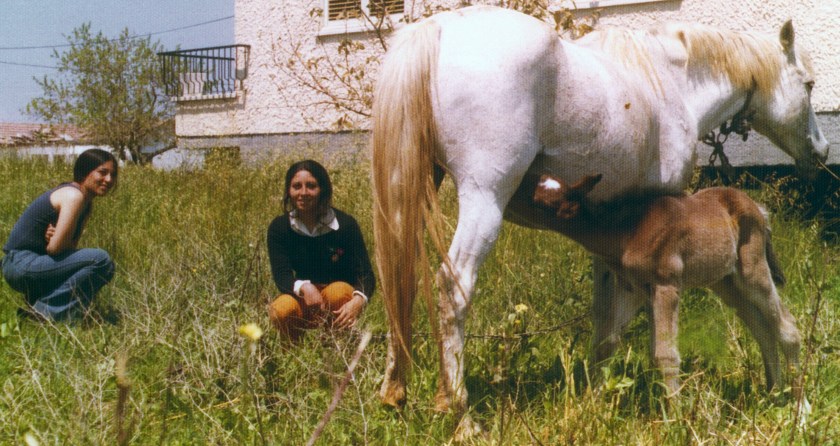 „Auf dem Foto oben, bin ich mit 21 Jahren. Die andere junge Frau ist meine Schwester. Wir sind in Israel bei meinen Eltern und haben gerade ein Fohlen bekommen. Die Aufnahme machten meine Eltern, kurz bevor ich meine Heimat verließ und nach Deutschland ging. Ich liebe das Foto sehr!“